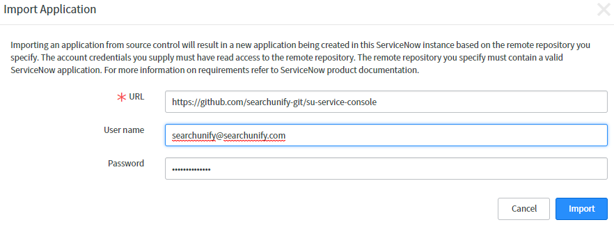 https://github.com/searchunify-git/su-service-consolein URL. - In User name and Password, enter the credentials that your SearchUnify representative has shared with you.