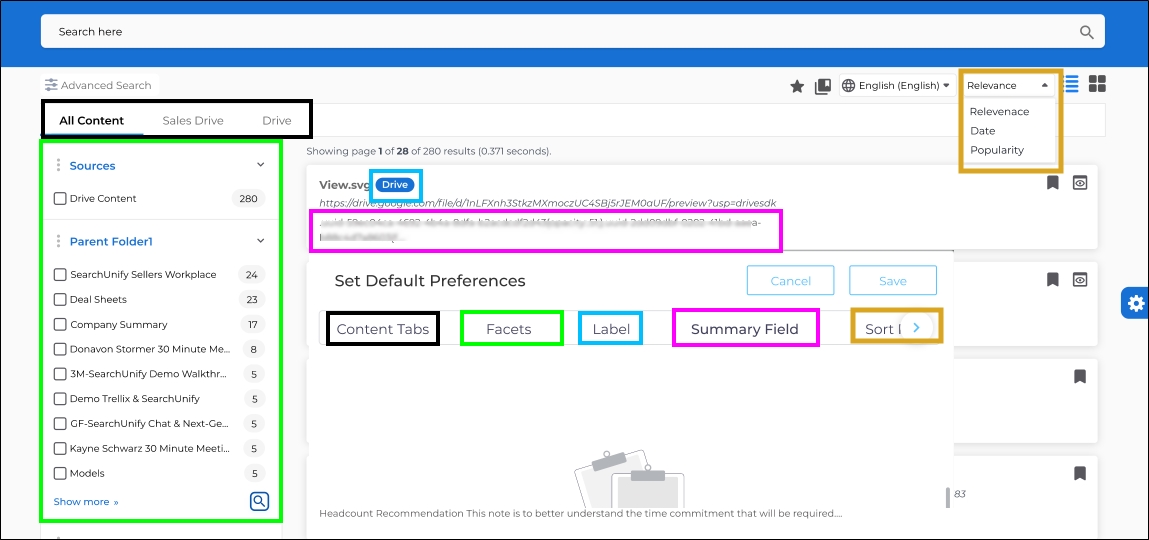 The content bar on top, facets on left, content tags, and result summaries are all configurable from Set Default Preferences. Using the features available in Set Default Preferences, an instance user can hide the content sources tab, reorder facets, tweak the summary text length, and even set the value that will appear in the content tag. All the features and their capabilities are listed next.