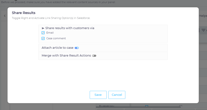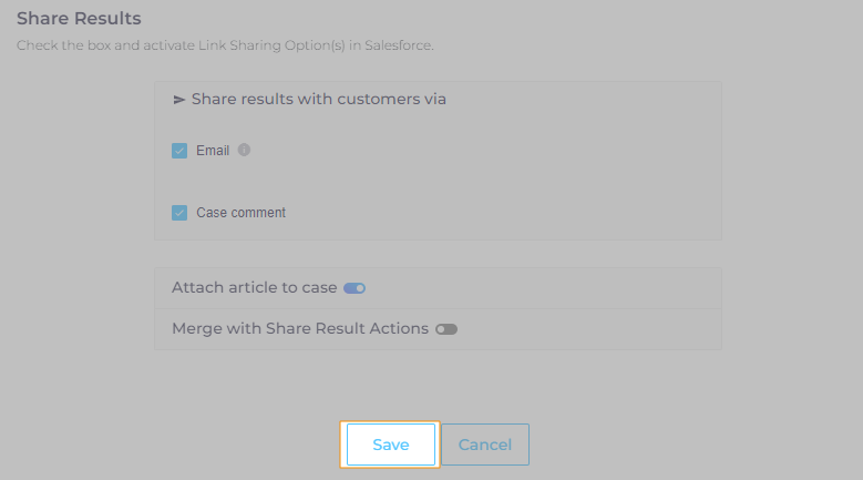 article. - Merge with Share Result Action. Works only on Salesforce Classic. Check it to perform two actions simultaneously. When you email an article, the article will be attached to case as well. When you publish an article as a case comment, it will be attached to the case as well.