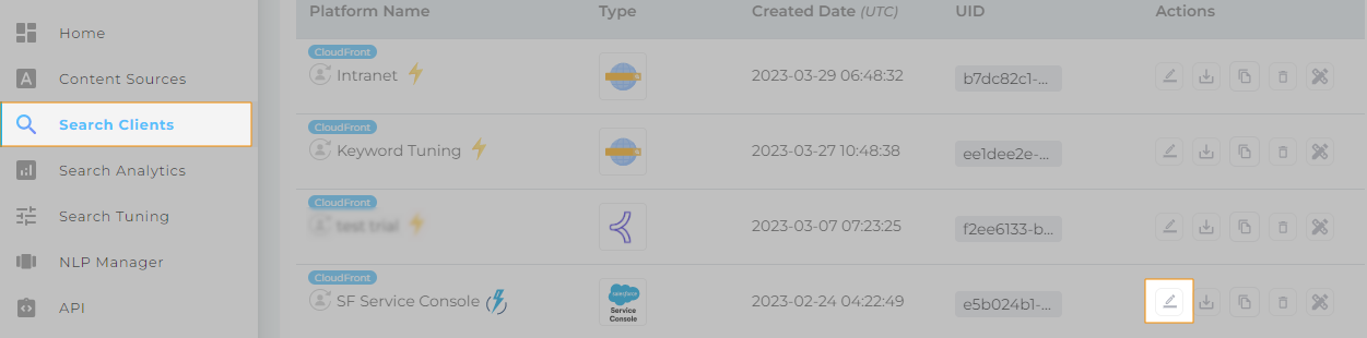 An admin can configure a Salesforce Console search client so that each result features a dropdown with two options: