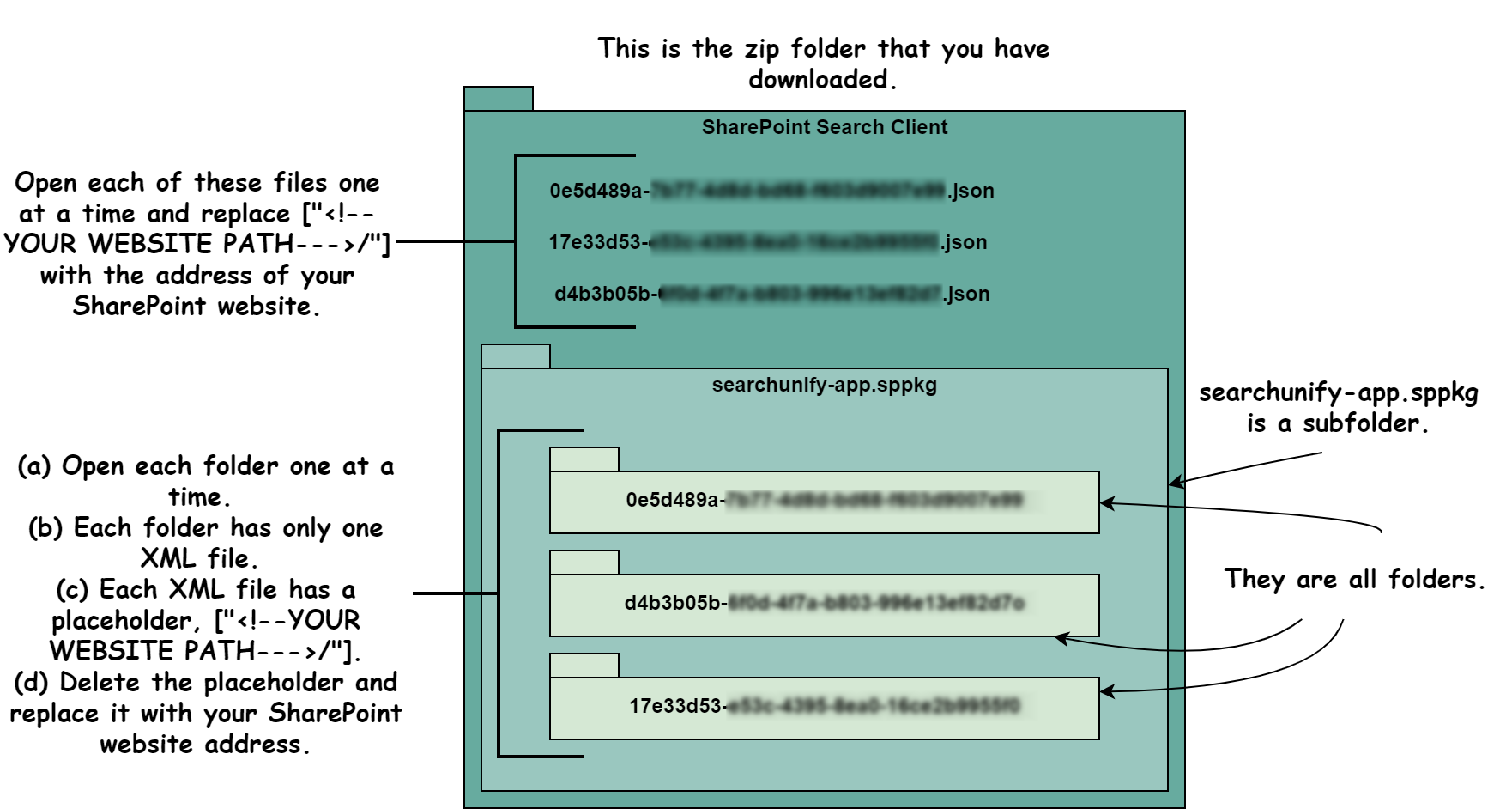 The zip folder is an app that can be installed on SharePoint. Before installation, swap the placeholders with your SharePoint website URLs in all the six files. Three files are JSON and can be found the root of the zipped folder. The remaining three files are XML—each in a folder of its own—in searchunify-app-sppkg (Windows) or searchunify-app-sppkg.zip (Linux). This section covers the details.