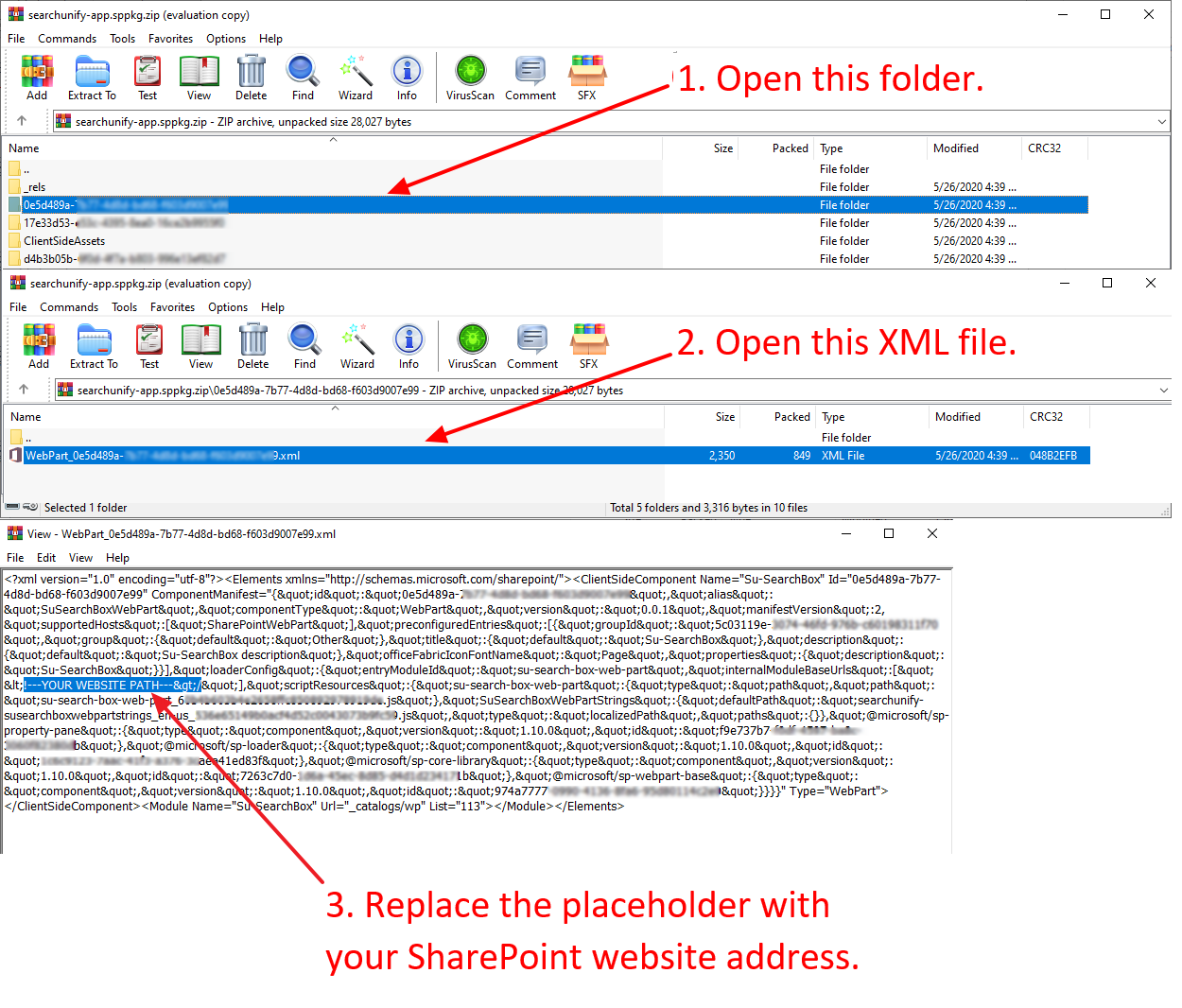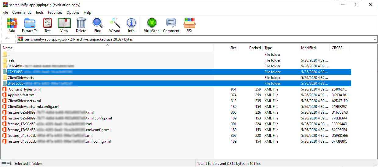 searchunify-app.sppkg(Windows) orsearchunify-app.sppkg.zip(Linux) and repeat the steps 6 and 7 for folders17e33d53-andd4b3b05b-. The XML files in these folders will beWebPart_{{FOLDERNAME}}.xml.