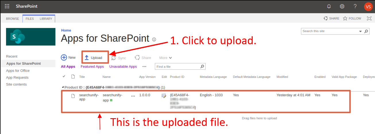 - Go to Apps for SharePoint, click Upload, and upload only