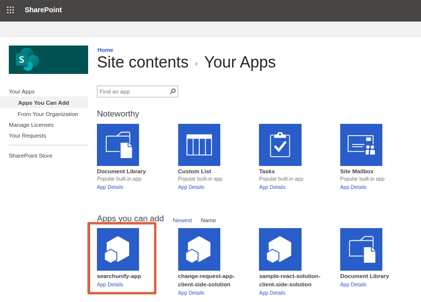 searchunify-sharpoint.sppkgfrom the zipped folder. Once you can see on SharePoint, click Deploy. - Open Settings from the main navigation bar on the top, and click Add an App.