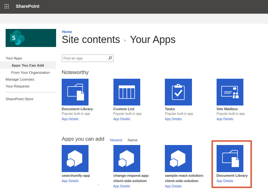 searchunify-app, double click on it, and then installsearchunify-webpart-client-side-solution. - Go to Document Library.The remaining search client files are stored here.