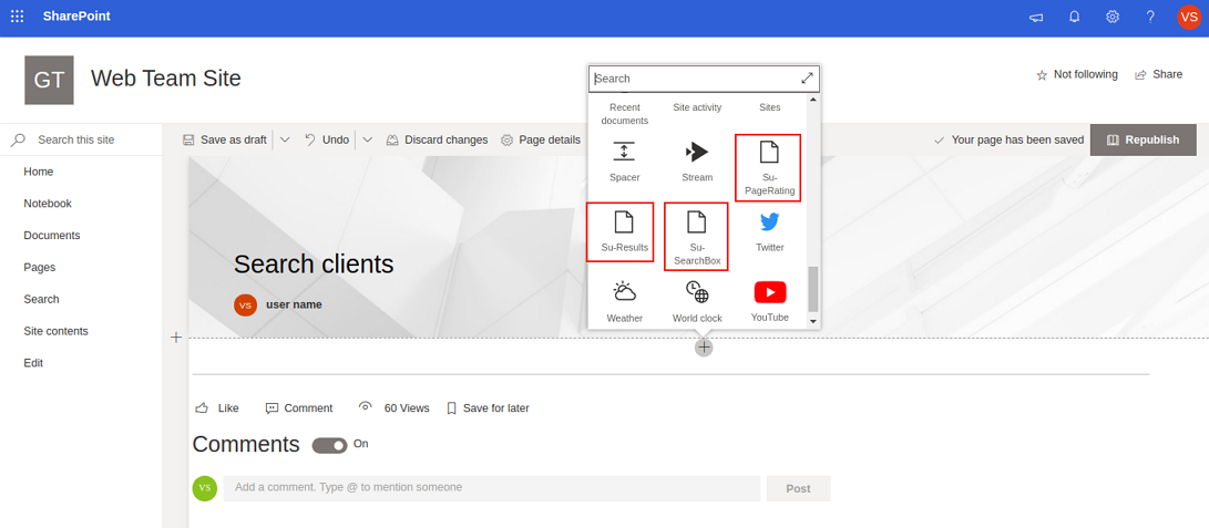 - Insert Su-PageRating, Su-Results, and Su-SearchBox on the page.