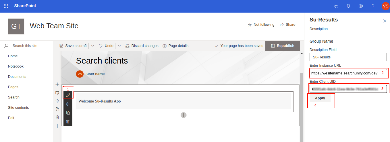 - Edit the Su-Results component, enter the search client UID, instance URL, and click Apply.