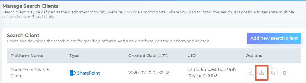 A prerequisite to downloading a SharePoint search client is to create it. If you have not already, then create a search client, connect it with content sources, and turn on analytics. Check out these articles for assistance: