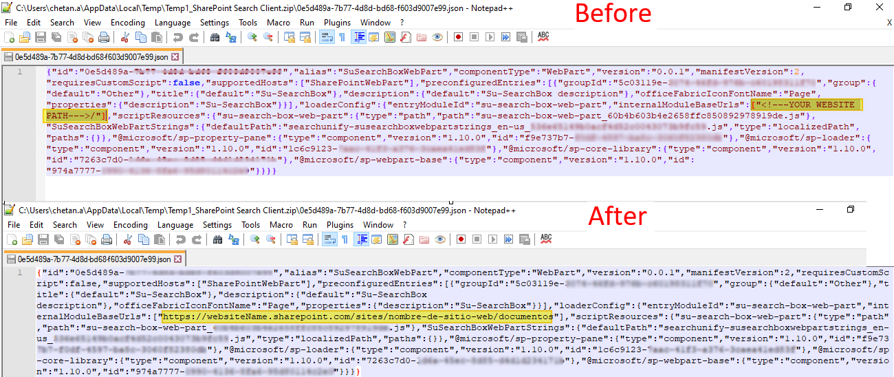0e5d489a-*****.json, find<!--YOUR WEBSITE PATH--->/and replace it with the address—with the site and document library name—of your SharePoint site.