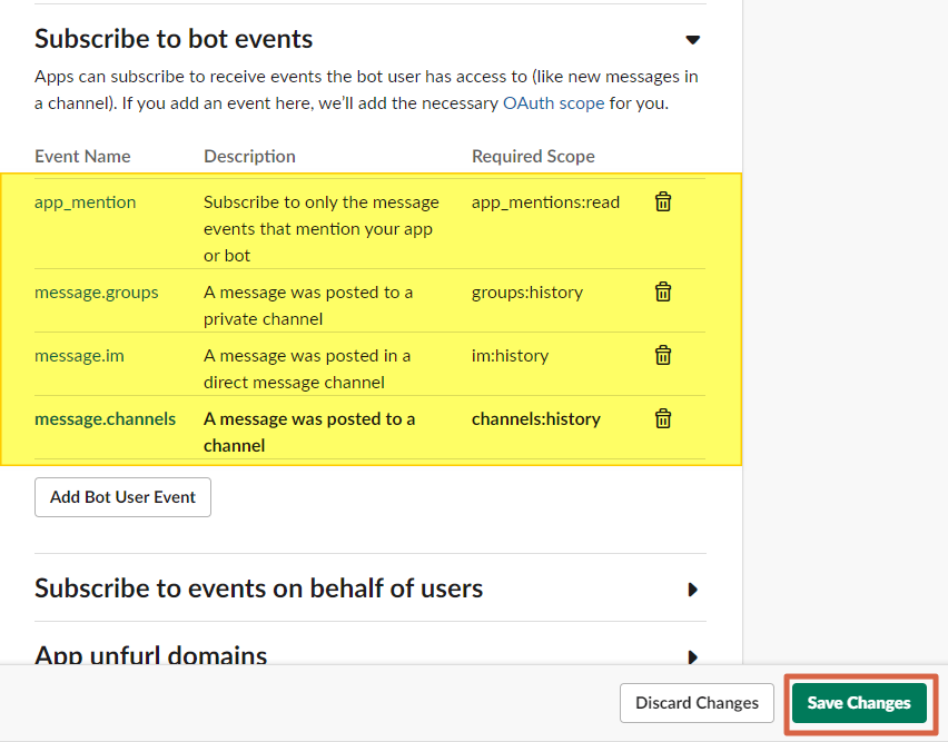 {{BASE_URL}}/slack/eventsin Request URL field. - Scroll down to Subscribe to Bot Events and add use Add Both User Event to add: app_mention, message.channels, message.groups, and message.im. After adding them, click Save Changes.