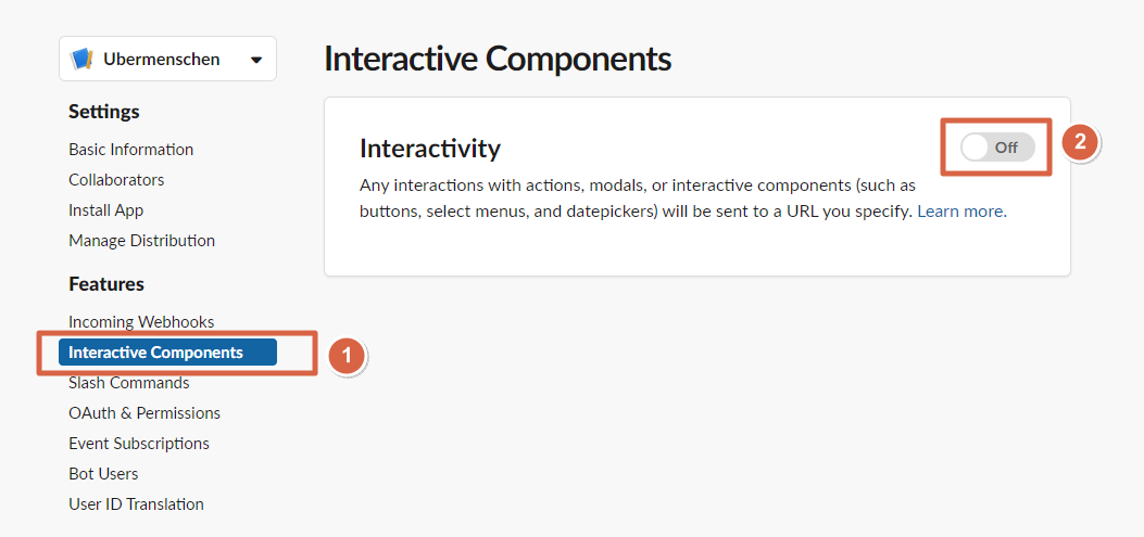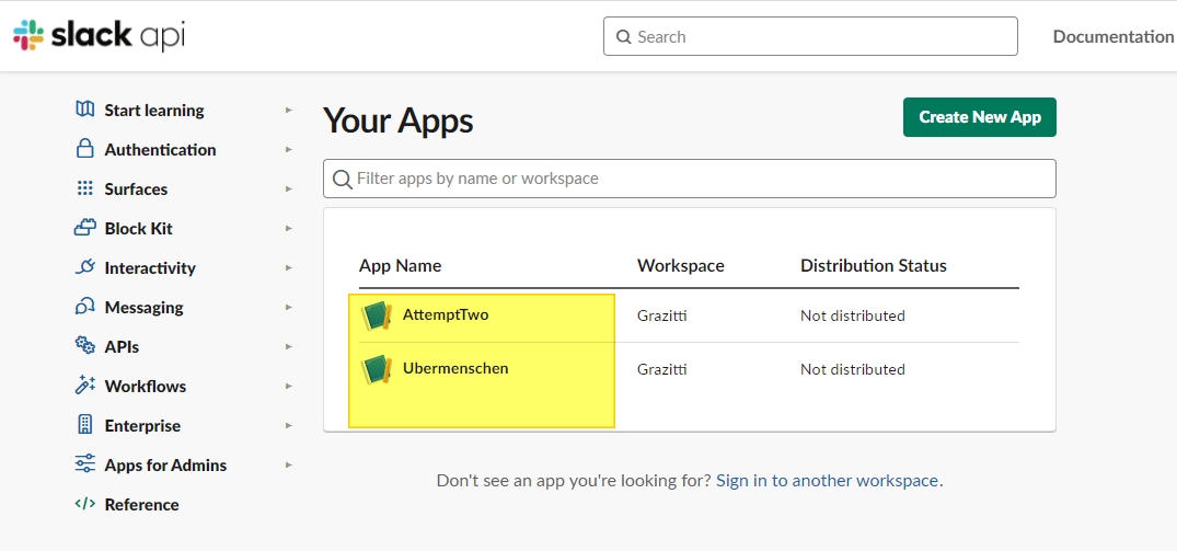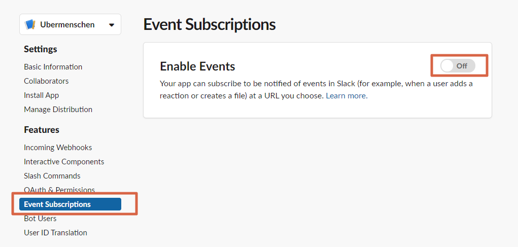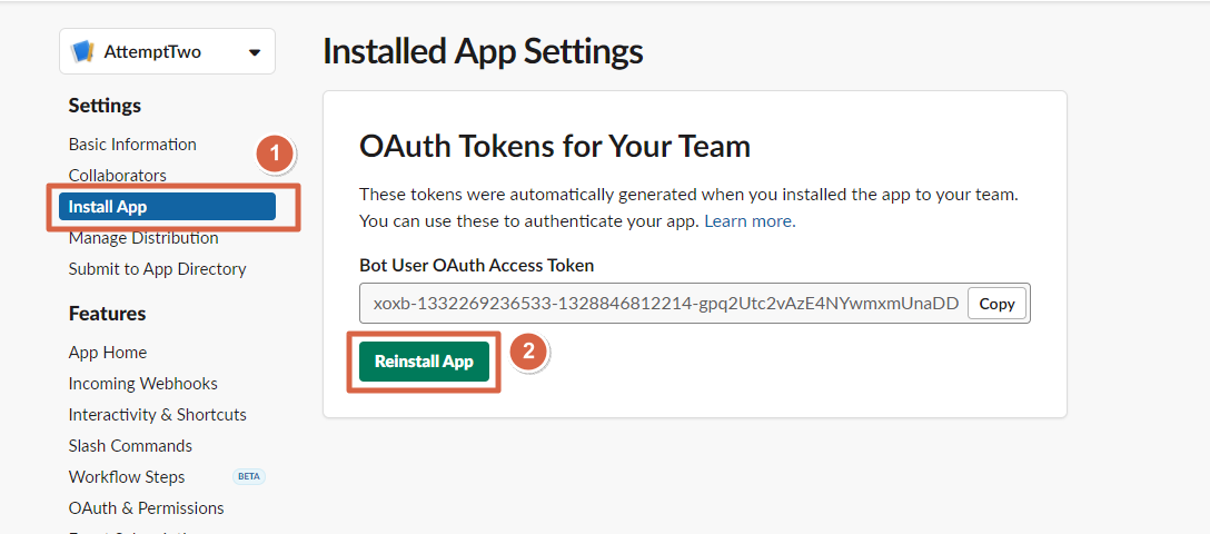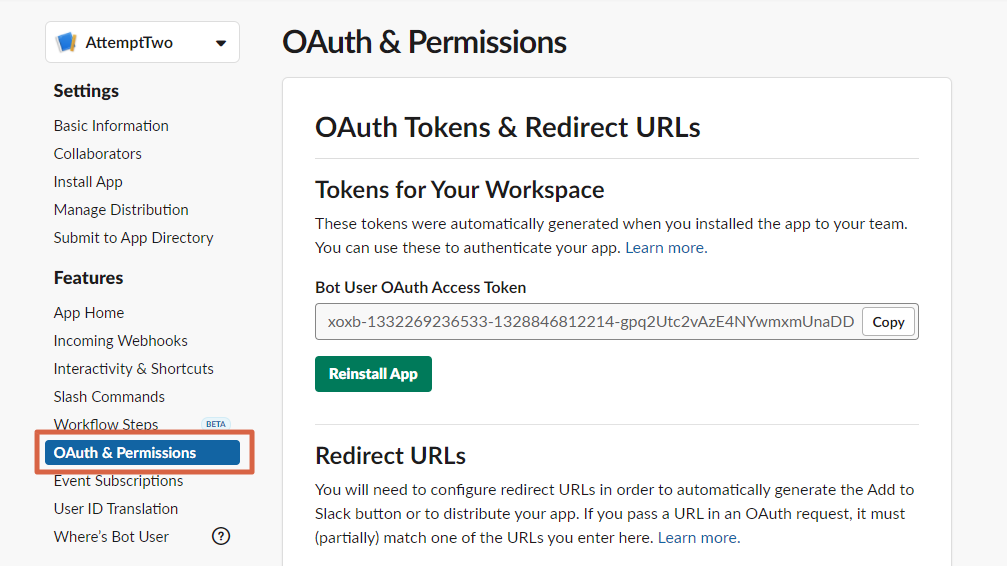 - Go to https://api.slack.com/apps and click your Slackbot app.