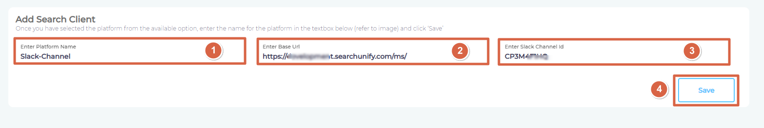 - Give your search client a name, enter your SearchUnify instance web address in the Enter Base URL field, and write your Slack team ID in the third field, and click Save.
