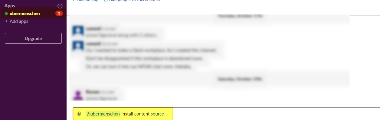 The ability to search enterprise data repositories inside Slack is a huge advantage. It saves time because there is no tab hopping, no cumbersome login screens, and no digressions involved. Users can run @botname <keyword> during a chat to find results immediately. In the next image, the bot name is "ubermenschen."