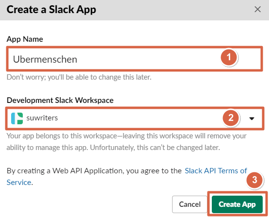 - Give your app a name, select a workspace for search client installation from the Development Slack Workspace dropdown, and click Create App.