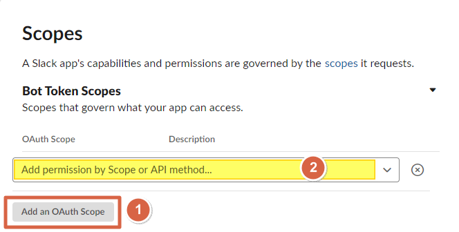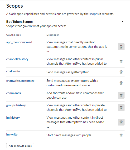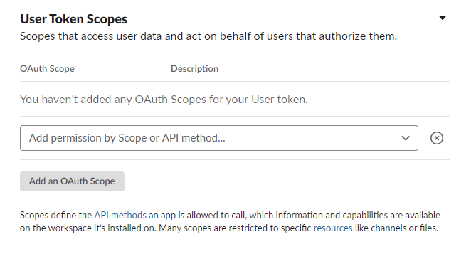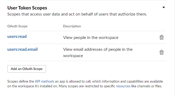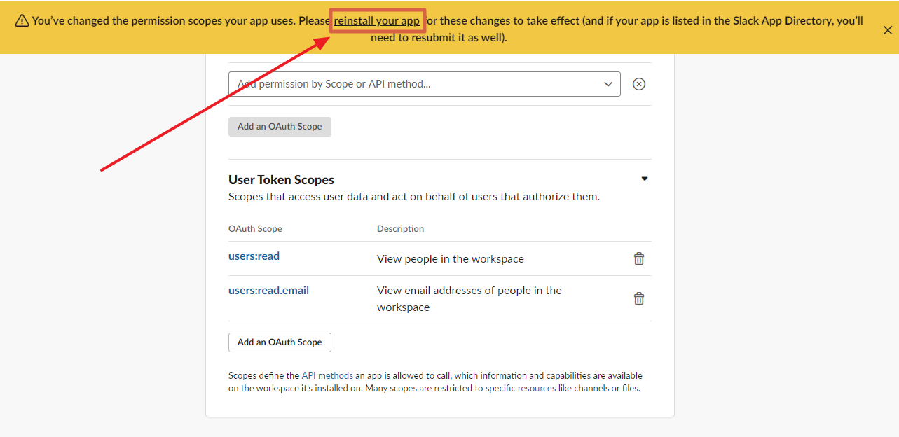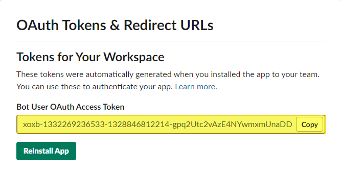 app_mentions:readand add it. Also addchannels:history,chat:write,chat:write.customize,commands,groups:history,im:history, andim.write. After adding them all, there will be eight scopes. - Refresh the page. Click Save Changes, if you are prompted to them. After the refresh, scroll up to find a new section, Tokens for Your Workspace. From this section, copy Bot User OAuth Access Token and share it with the SearchUnify team to be able to use facets.