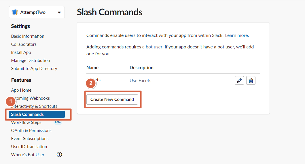 - Open Slash Commands in the left sidebar and click Create New Command.