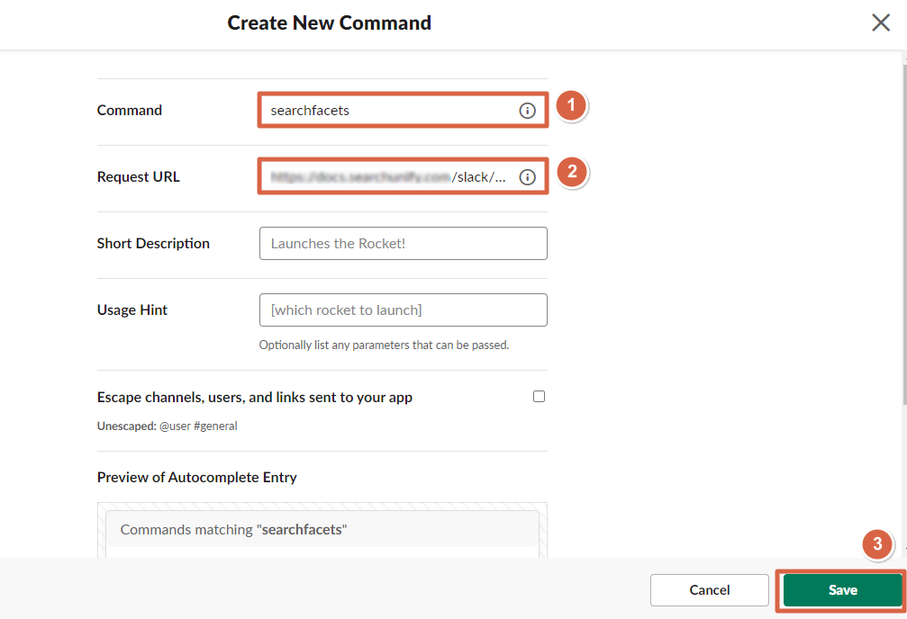 {{baseUrl}}/slack/slash. Short Description and Usage Hint are optional. Click Save.