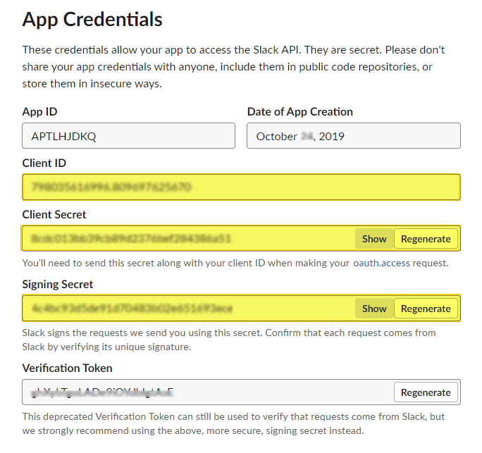 - On the app page, scroll down to App Credentials and copy Client ID, Client Secret, and Signing Secret. Share them with your SearchUnify representative.