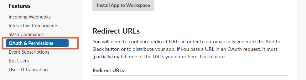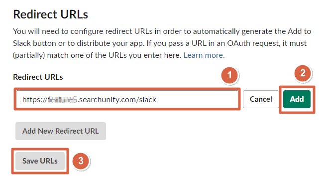 {{BASE_URL}}/slackin Redirect URLs field. Click Add, then Save URLs. The{{BASE_URL}}is the web address of your SearchUnify instance. - Scroll down to Scopes > Bot Token Scopes, click Add an OAuth Scope. A search box will appear.