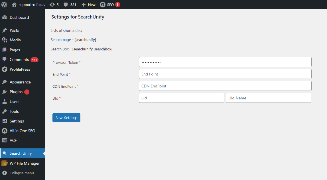 After you have successfully configured the SearchUnify package, place the [SearchUnify] shortcode on the page where you want to deploy the search.