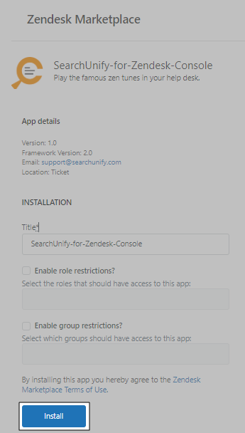 - Set up Role restrictions and Group restrictions and click Install. Setting up Role and Group restrictions is optional.