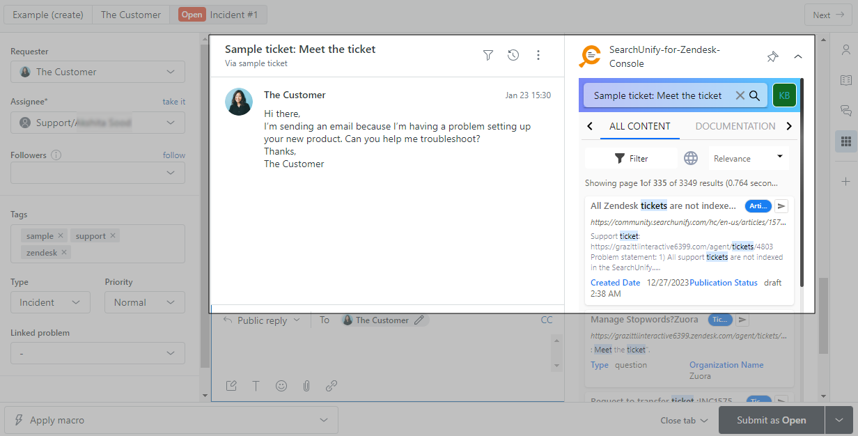 To use the search client, first open a ticket in Zendesk Console and then launch SearchUnify from Apps. You will see results related to the opened ticket.