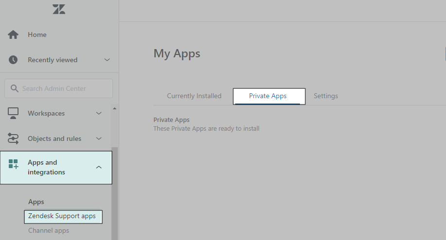 - Open Apps and Integrations. Go to Zendesk Support Apps > Private Apps.