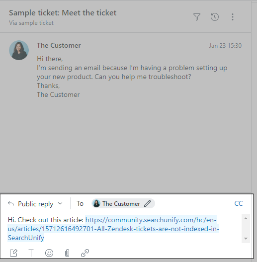 Using Attach to Ticket, you can insert a knowledge article into your reply.