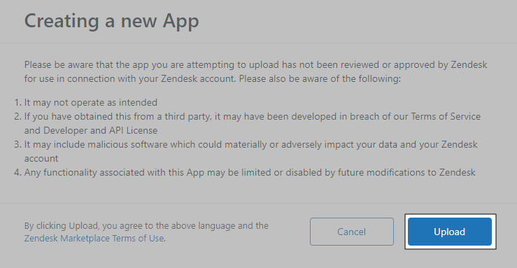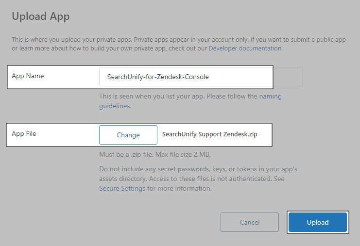 - Enter an App Name and upload the Zendesk Console search client using Choose File. Click Upload.