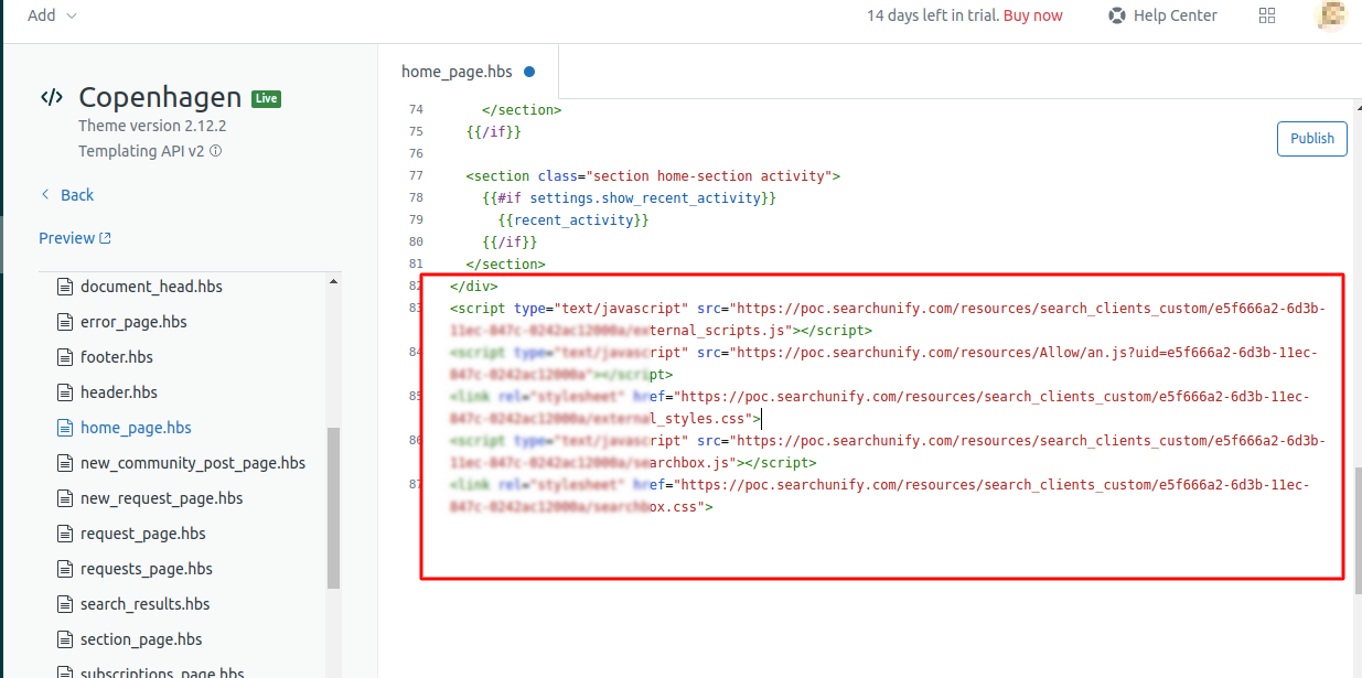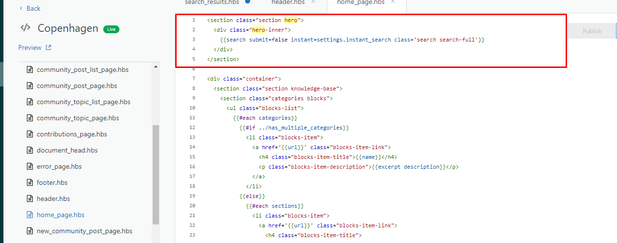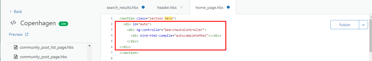hero-innerwith the code copied fromautocomplete.html. (You can findautocomplete.htmlin the downloaded search client.) - Copy scripts from autocomplete.html and paste in home_page.hbs at the end.