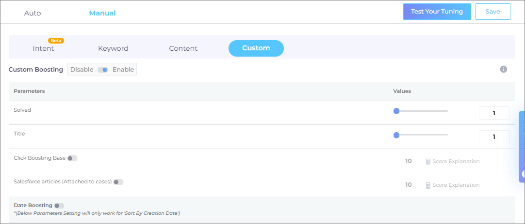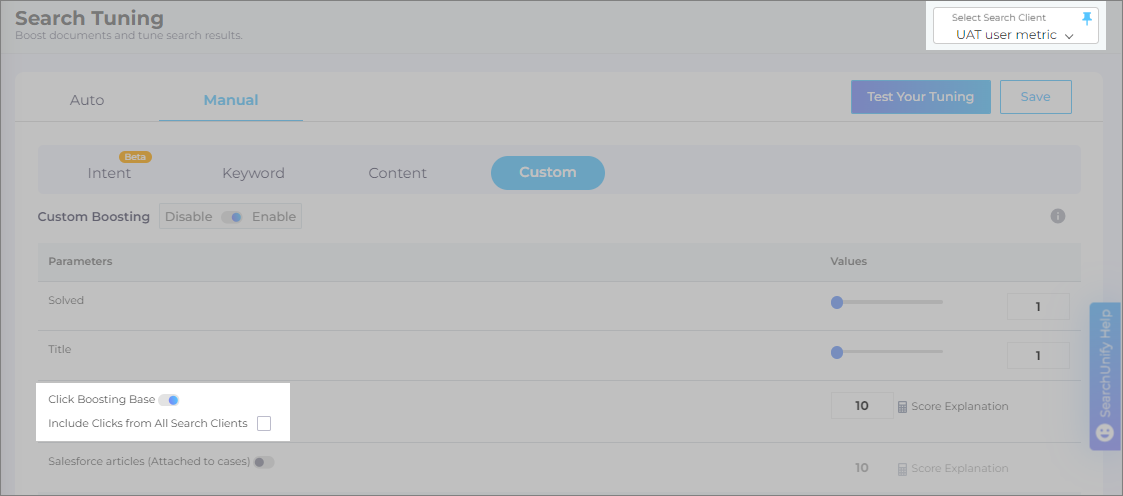 To view any custom settings, select a search client and toggle on Custom Boosting.