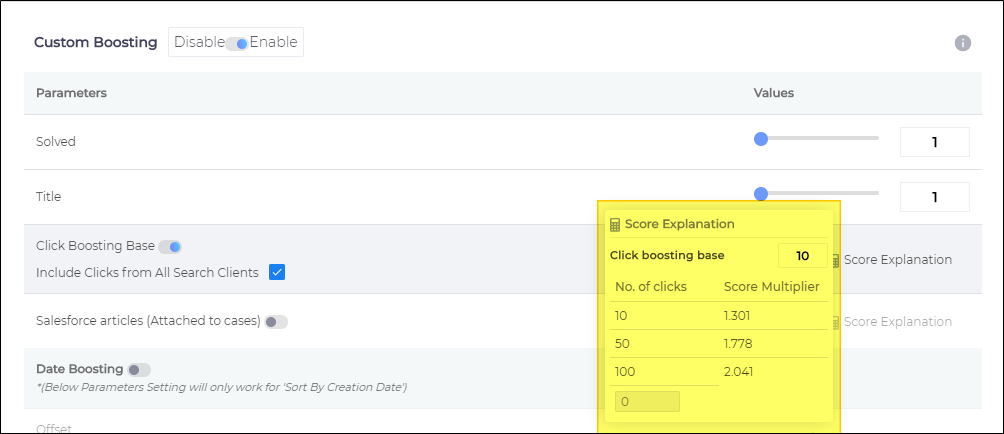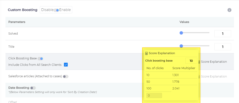In the default configuration, if a document D has been clicked on 10 times for a keyword K, then D's relevance score is automatically increased by approximately 30% for that keyword. Administrators have the flexibility to modify this boost rate. To do so, simply click anywhere within the Click Boosting Base field and replace the default value of 10 with a different integer.