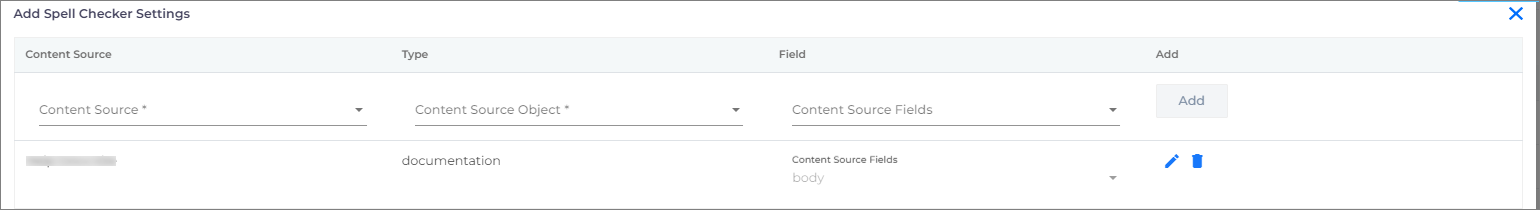 - Select the content source, content object, and content source fields and click Add. In the example below, body text is going to be auto-corrected. Make sure you select the content source with the most accurate and relevant data. Auto Spell Corrector is trained on the selected content source data.