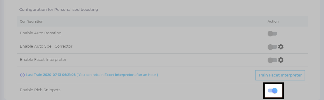 To turn off rich snippets, select a search client and toggle Enable Rich Snippets to the left.