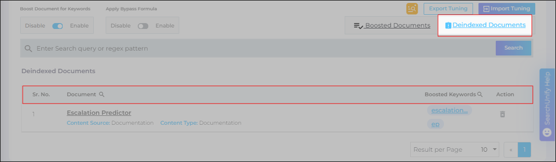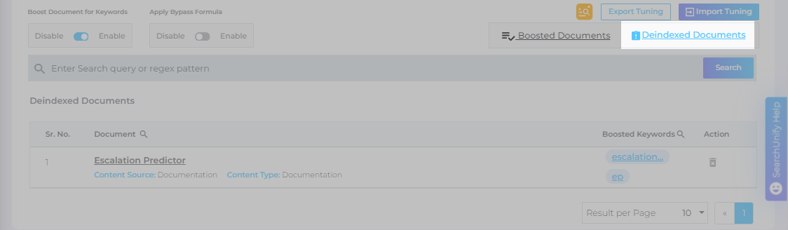 The Deindexed Documents tab lists previously boosted documents that are no longer indexed. Use this tab to review and remove any deindexed documents.
