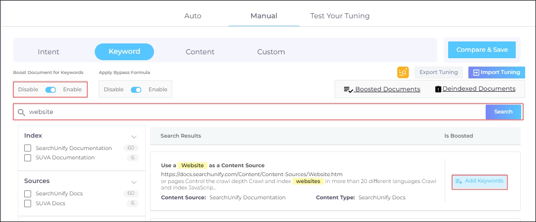 To use Keyword Tuning, navigate to Search Tuning > Manual Tuning > Keyword.