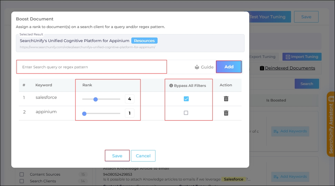 Fig. A snapshot of the Boost Document dialog. The "SearchUnify's United Platform for Appinium"d ocument has been boosted for the keywords "salesforce" (rank 4) and "appinium" (rank 1).