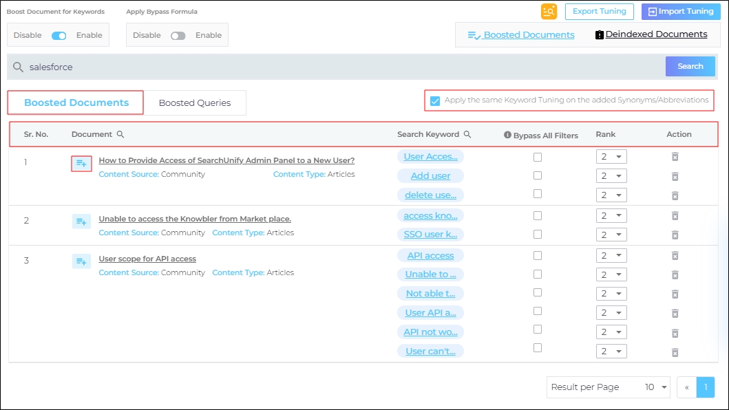 Apply the same Keyword Tuning on the added Synonyms/Abbreviations. Enabling this option extends keyword boosting to include all associated synonyms and abbreviations.