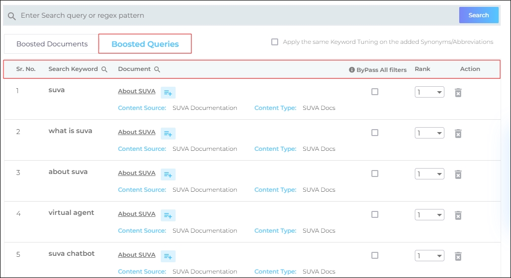 The Boosted Queries feature allows you to manage keywords for which one or more documents have been boosted. Below is an explanation of the key columns in the feature: