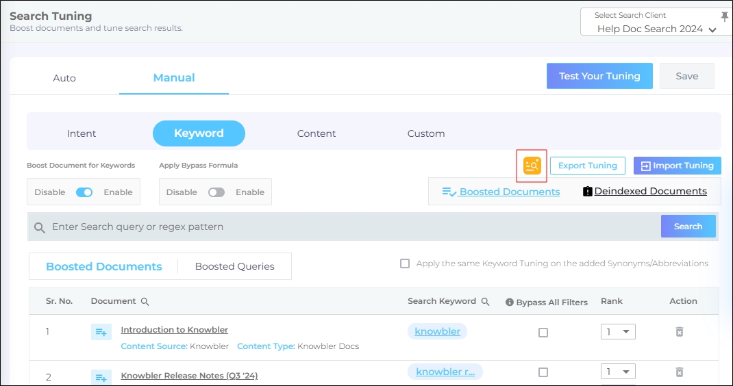 Keyword Tuning ensures that documents appear at the assigned rank for the specified query or its synonyms (if present in the document).
