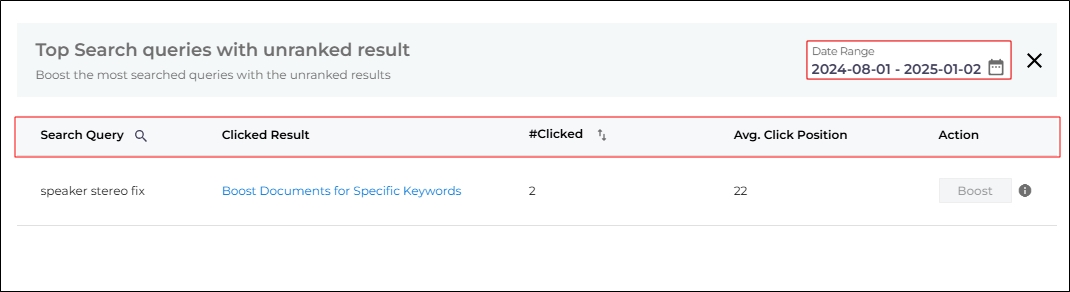 This report highlights frequently clicked documents buried in search results. Using this report, you can identify potential candidates for boosting based on user clicks and average click position.