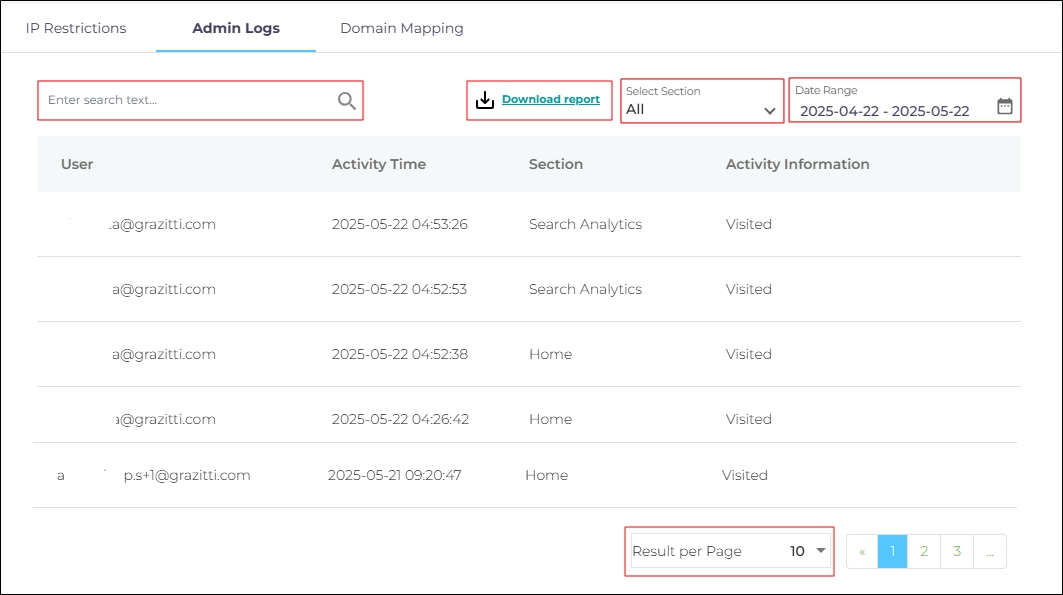 Download Report feature allows you to download up to 10,000 rows of Admin Logs in a CSV file.