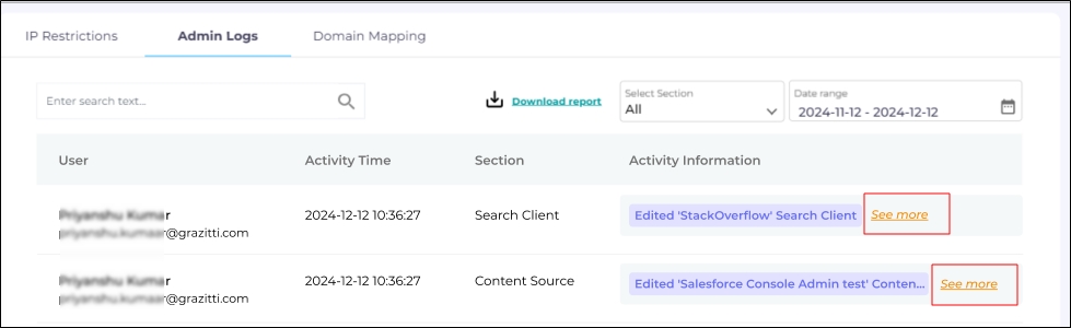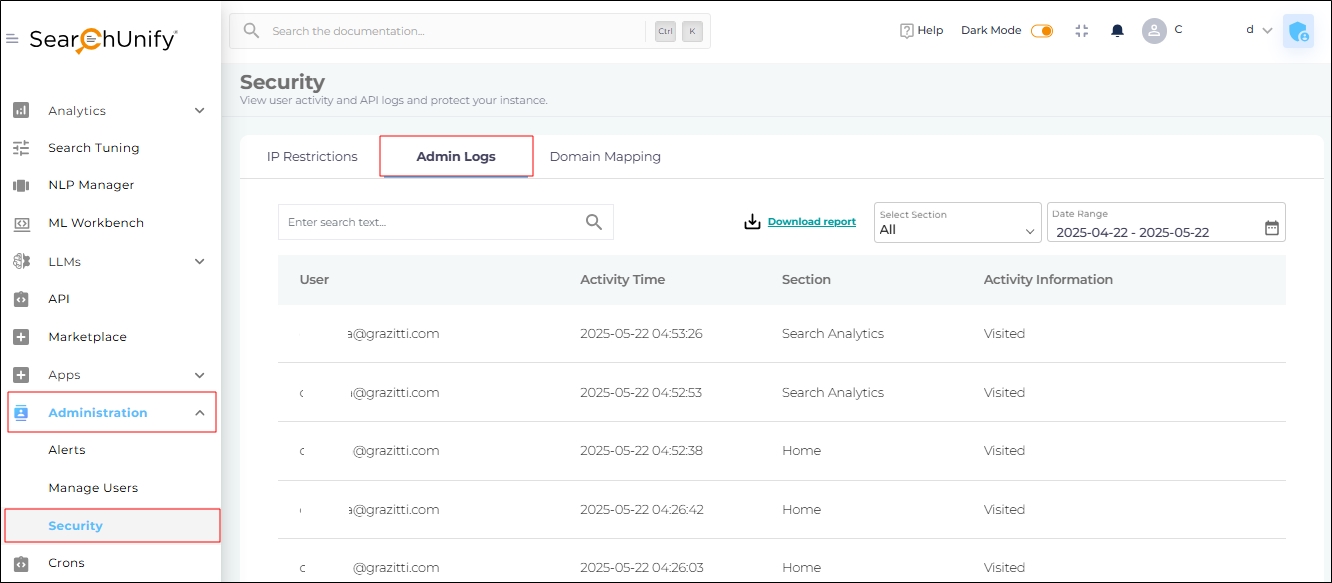 Admin Logs within Security track all admin activities within the SearchUnify instance. Using Admin Logs, you can associate changes made to Content Sources, Search Clients, Search Tuning, and NLP Manager with specific users. The log data can be viewed directly in your browser or downloaded as a CSV file.