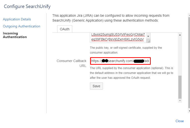 https://{{yourSearchUnifyInstanceURL}}/admin/authorization/oAuthCallbackJira/ - Press Save.